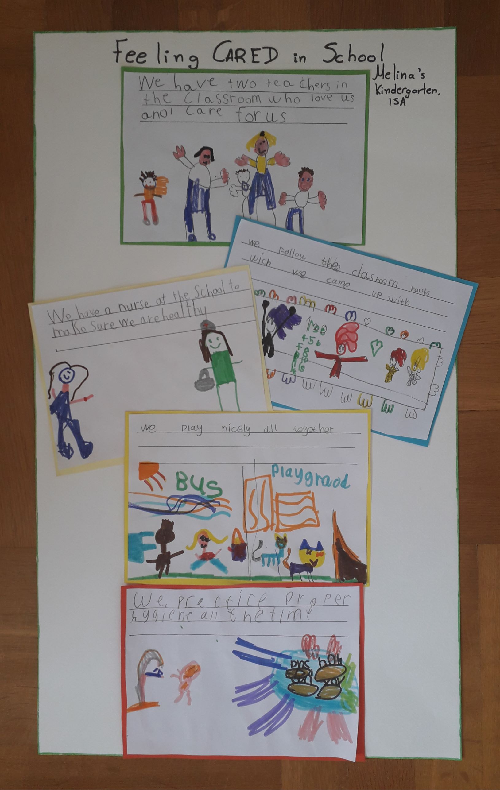 Kindergarten students worked collaboratively in order to create a poster that shows what makes them feel safe and cared in the school environment.