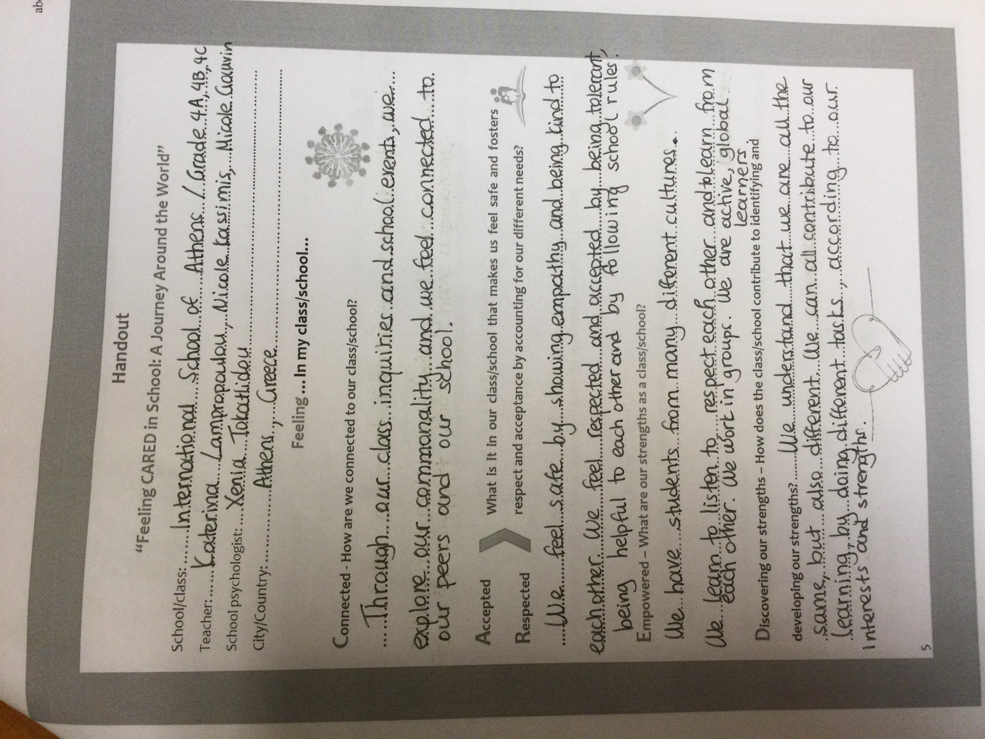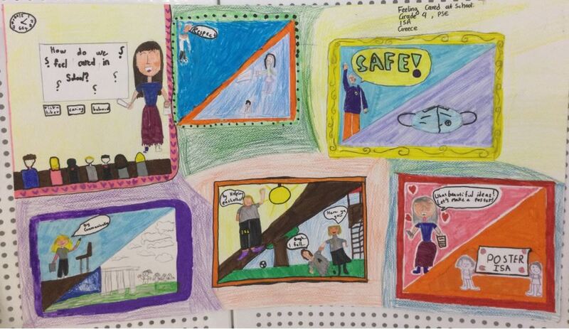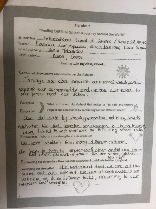 Fourth grade students discussed about what makes them feel connected, safe and respected at school. Then they worked collaboratively to make a poster that shows what makes them feel cared for at school.