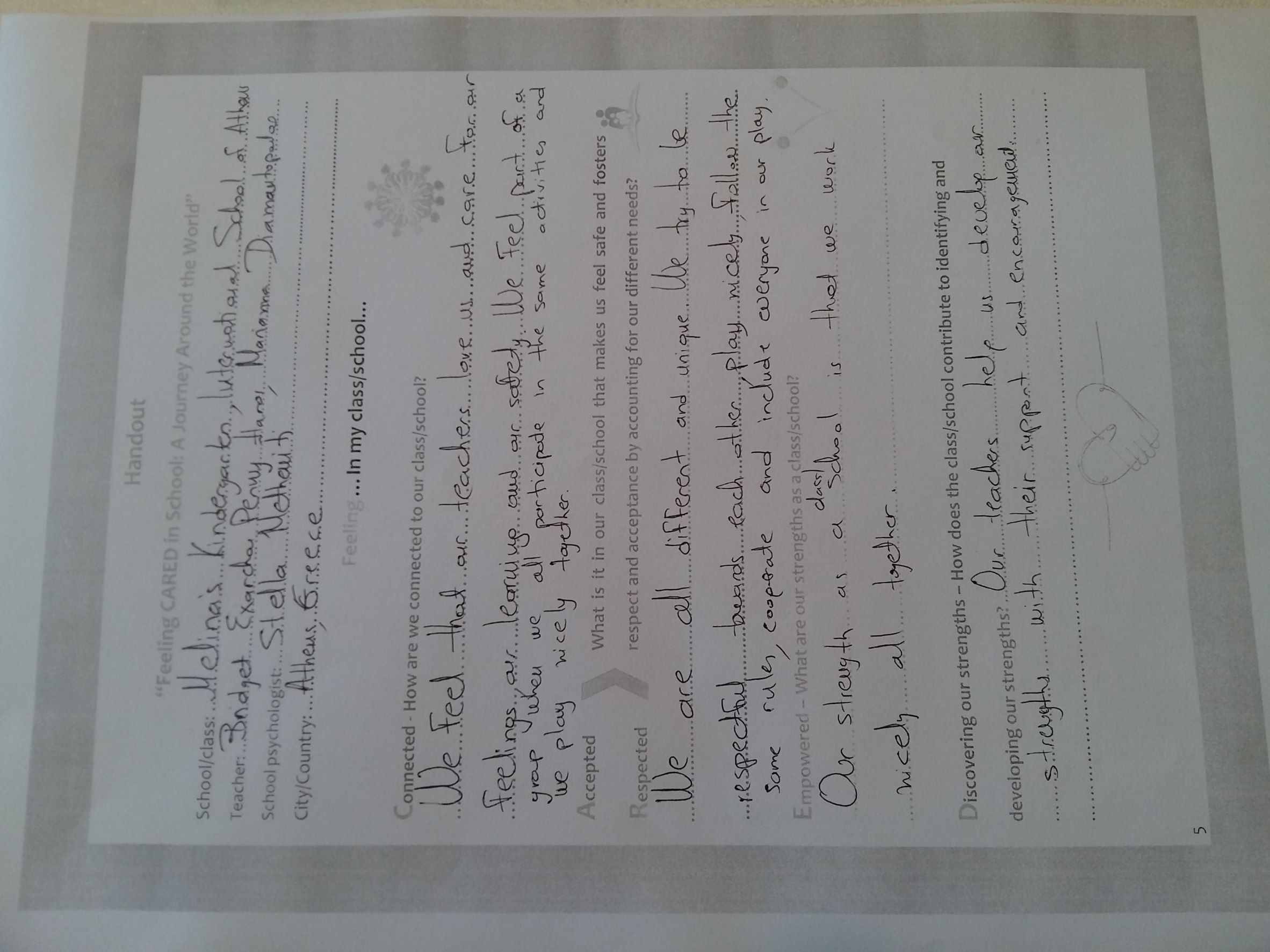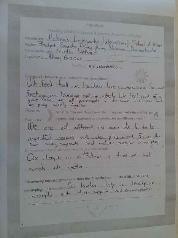 Melina's kindergarten students discussed about the factors that help them to feel cared in school.