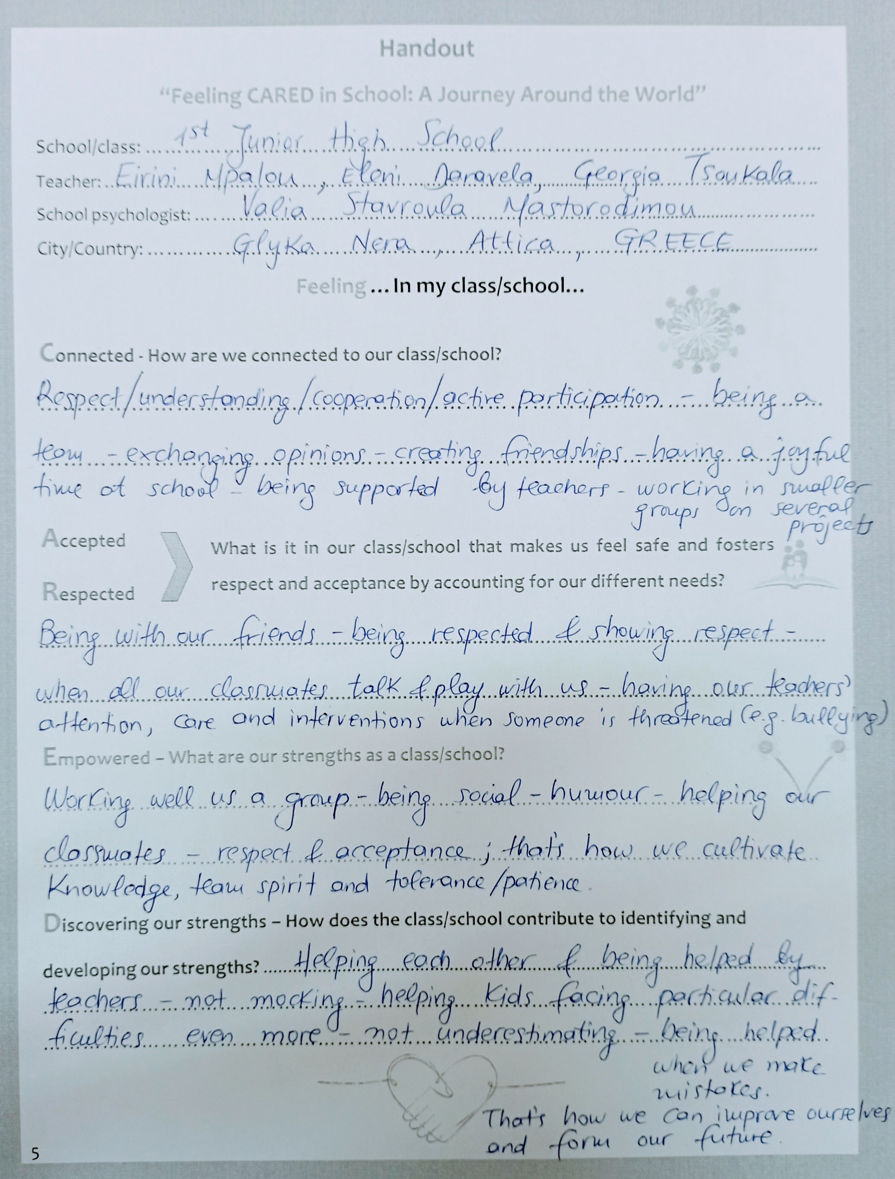 The 2nd grade worked together with the psychologist and the teachers of english language and theology, in order to discuss on the subjects proposed. They worked in smaller groups and presented their ideas in the plenum. The art teacher worked with students from the 1st and the 3rd grade, in order to create an inclusive and vivid image to represent school as a warm hug for students.